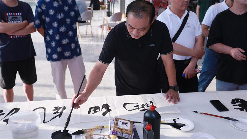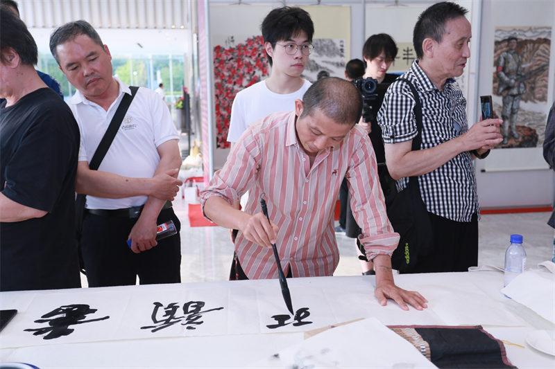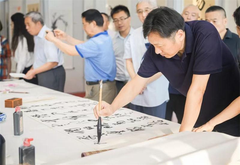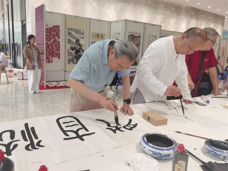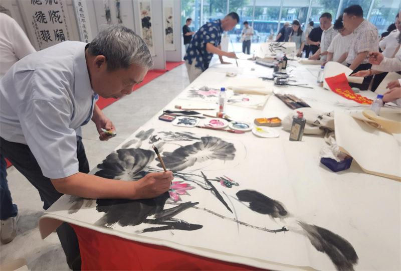 开幕式现场,各有关单位代表分别致辞,表达了对历史的铭记,对伟大抗战精神的传承与弘扬。参展书画家代表分享了创作抗战主题作品的情感和心得,解读了作品中对民族精神、革命精神的艺术表达,并现场捐赠了书画作品。上海安徽经济文化促进会淮北分会荣誉会长、民进中央原副主席、著名社会学家邓伟志先生发来贺信,深情回顾了抗战时期淮北根据地的英勇事迹。开幕式结束后,还举办了书画交流笔会,三十多位书画家现场献艺,挥毫泼墨、笔走龙蛇,山水丹青、意蕴尽显。