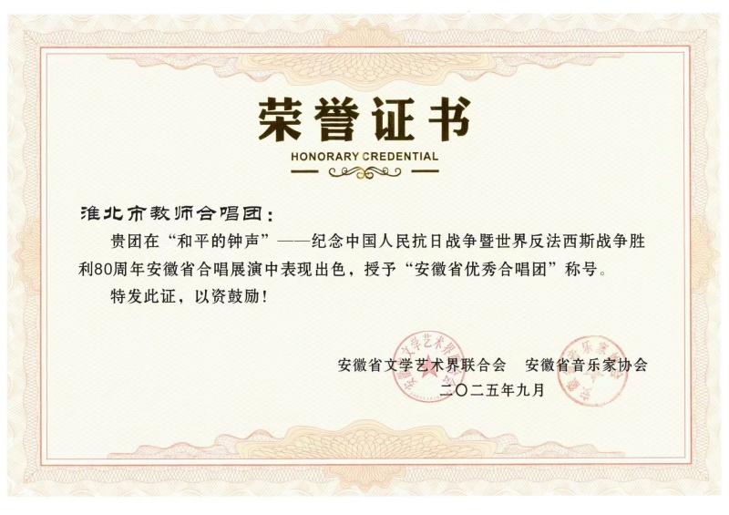 本次展演,由《烽火岁月》《壮丽山河》《和平颂歌》三个篇章共19首歌曲组成,涵盖了混声合唱、无伴奏合唱、女声合唱、童声合唱等多个艺术表演形式。当天,来自全省各地的19支合唱团队、近1200名表演者,用歌声生动呈现了中华民族14年艰苦卓绝的抗战历程,彰显了中国共产党在全民族抗战中的中流砥柱作用,深情表达了江淮儿女对党的深切热爱和对祖国的美好祝福。由淮北市音舞协选送、市教师合唱团演唱的《没有共产党就没有新中国》压轴登场,惊艳亮相,用饱满的热情、嘹亮的歌声,唱出了对党的无限忠诚和对祖国的深深热爱,赢得领导和观众的高度肯定和一致好评!被授予“安徽省优秀合唱团”荣誉称号。