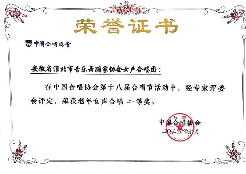 2025年10月15日,由中国合唱协会主办的中国合唱协会第十八届合唱节在青岛圆满落下帷幕。本届合唱节以“山海天籁・歌涌青岛”为主题,吸引了来自全国各地的60余支优秀合唱团队齐聚一堂,成为全国合唱艺术领域的一次盛会。合唱节共历时4天,期间举办了5场精彩展演,各合唱团队集中演绎了多部经典合唱作品,展现了新时代中国合唱艺术的合唱艺术的多元风貌与深厚底蕴。淮北市音乐舞蹈家协会女声合唱团用歌声传递情感,用和声凝聚力量,这支由热爱合唱的歌者组成的团队,在全国众多顶尖合唱团队、3000余名参赛者中脱颖而出,凭借精湛演绎,勇夺女声合唱(老年组)二等奖,生动诠释了淮北文艺界的昂扬精神风貌。
